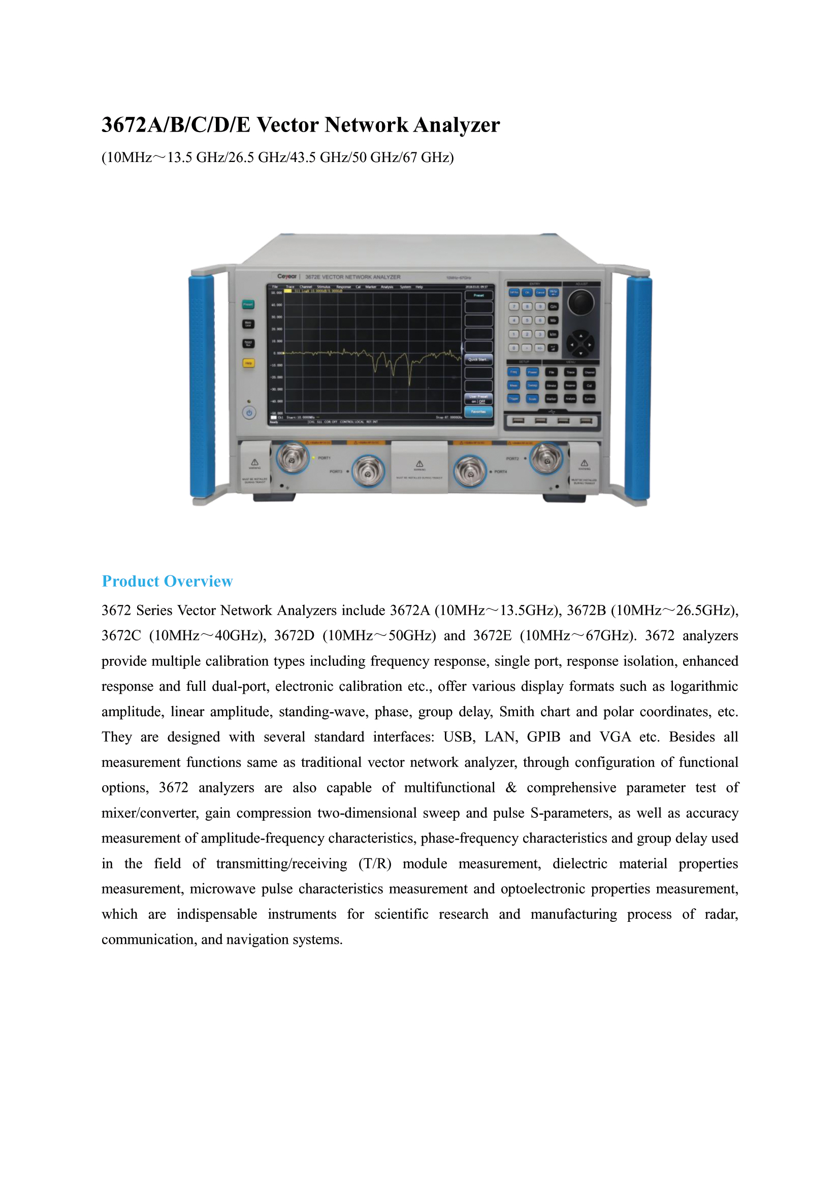 Analizatory serii 3672 oferują wiele typów kalibracji, w tym: odpowiedzi częstotliwościowej, jednoportową, wzmocnionej odpowiedzi i pełną dwuportową, kalibrację elektroniczną, itp.; różne formaty wyświetlania, takie jak amplituda w skali logarytmicznej lub liniowej, fala stojąca, faza, opóźnienie grupowe, wykres Smith’a i współrzędne biegunowe. Wyposażone są w standardowe interfejsy: USB, LAN, GPIB, VGA itp. Poza wszystkimi funkcjami pomiarowymi oferowanymi przez tradycyjne analizatory sieci, urządzenia serii 3672 są również w stanie przeprowadzać wielofunkcyjne i kompleksowe testy parametryczne miksera/konwertera, dwuwymiarowe testy kompresji wzmocnienia, przemiatania i parametrów rozproszenia impulsów (s-parametrów), a także wykonywać pomiary dokładności charakterystyk amplitudowo-częstotliwościowych, fazowo-częstotliwościowych, opóźnień grupowych stosowanych przy pomiarach modułów nadawczo-odbiorczych (T/R), pomiary właściwości materiałów dielektrycznych, charakterystyk impulsów mikrofalowych i pomiary właściwości optoelektronicznych. Urządzenia te są niezbędnymi przyrządami do celów naukowych oraz związanych z systemami radarowymi, komunikacyjnymi i nawigacyjnymi.