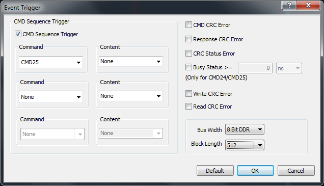 - Wyzwalanie zdarzeń:3 kroki sekwencji CMD;CCRC error trigger;Busy Time trigger (dla eMMC)