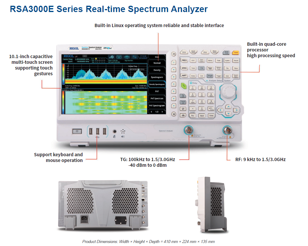 Seria Rigol RSA3000E to analizatory widma 5 w 1 z analizą widma w czasie rzeczywistym, analizą widma typu sweep, skalarnym analizatorem sieci (model -TG), odbiornikiem EMI i demodulacją cyfrową. Zakresy częstotliwości wynoszą od 9kHz do 1.5/3GHz. W serii są dostępne modele ze źródłem śledzącym (modele „-TG”), które mogą być szeroko stosowane w przedsiębiorstwie R&D, produkcji fabrycznej oraz pracach naukowych.