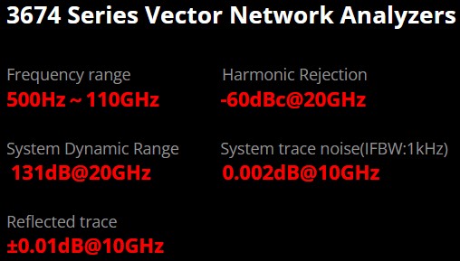 Dwu lub czteroportowy wektorowy analizator sieci Ceyear 3674K o rozdzielczości częstotliwości: 0.1 Hz; zakresie częstotliwości: 500 Hz~53 GHz i dokładność częstotliwości ±1×10-7.