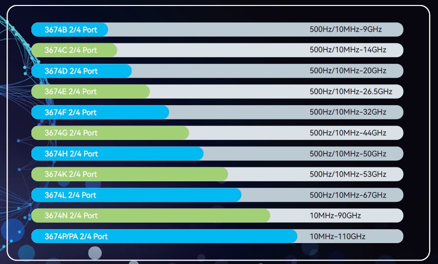 Seria 3674 wektorowych analizatorów sieci obejmuje modele: