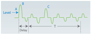 Miernik mocy 66205 posiada wbudowaną funkcję pomiaru prądu rozruchowego (Is). Użytkownicy mogą ustawić poziom natężenia prądu do wyzwolenia punktu początkowego pomiaru. Użytkownicy mogą również użyć zewnętrznego sygnału TTL do wyzwalania pomiarów prądu rozruchowego poprzez port sygnałowy we/wy sterujący umieszczony z tyłu urządzenia. Parametr opóźnienia może pomóc użytkownikom w ominięciu wartości szczytowej B po punkcie wyzwolenia A. Parametr T pozwala na ustalenie ustawionego okresu czasu na pomiar wartości szczytowej w zadanym czasie (T).