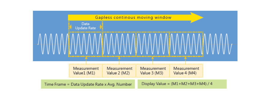 Metoda pomiaru parametru : bez przerwy ciągłe ruchome okno uśrednia pomiary parametrów napięcia i prądu w ramach czasowych. Uwaga: ustawienie czasu w przedziale czasowym jest równoważne z szybkością aktualizacji danych x ustawienie numeru AVG.