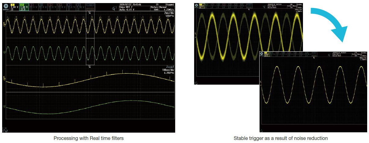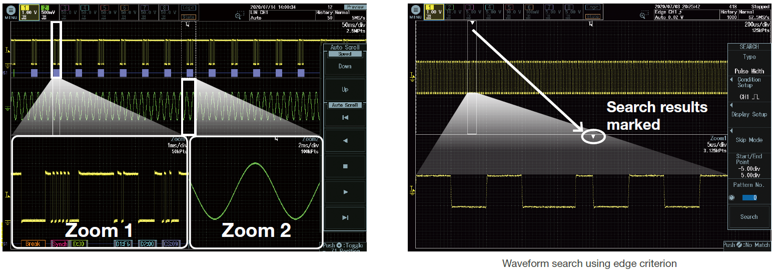 Seria DLM5000 umożliwia zapis do 100000 wcześniej przechwyconych przebiegów. Za pomocą funkcji Historia istnieje możliwość wyświetlenia jednego lub wszystkich przechwyconych przebiegów oraz wykonywać na nich pomiary i obliczenia.