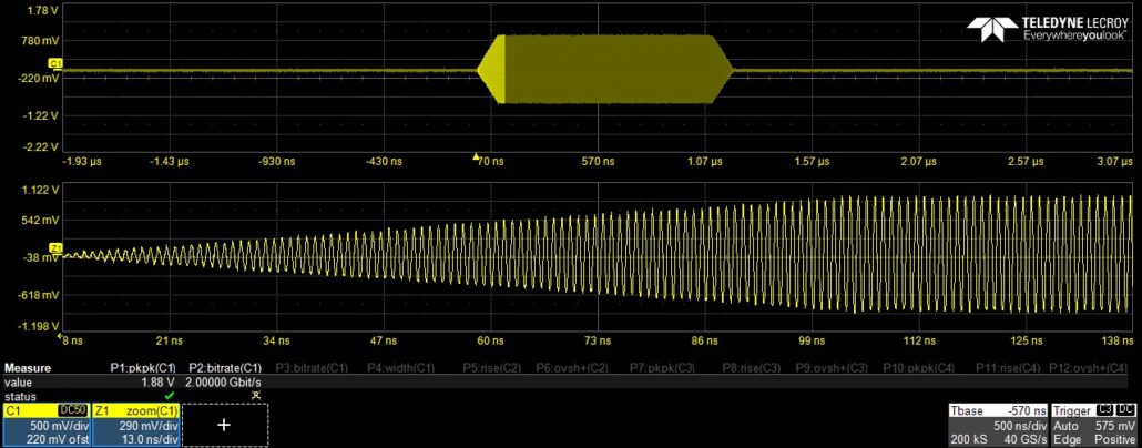 - Wyjście single ended z maks. 5 Vp-p przy 50 Ω z przesunięciem sprzętowym ±2,5V na 50 Ω. Łącznie okno napięcia wyjściowego ±5 V (10 Vp-p) przy 50 Ohm