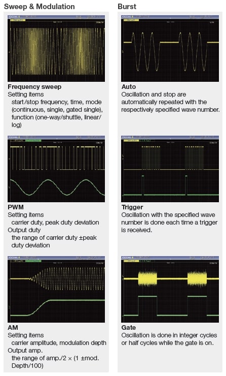 - Przebiegi wyjściowe: Sinusoidalny, kwadratowy, impulsowy, rampowy, przebieg zmienny parametrycznie, szum, DC i przebiegi arbitralne