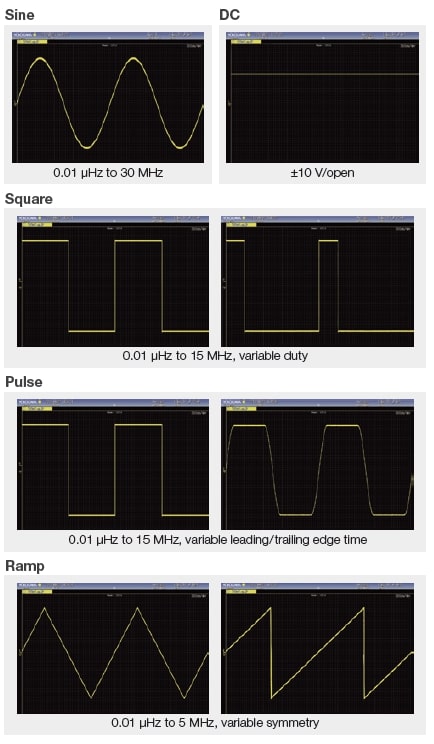 - Zakres częstotliwości: Fala sinusoidalna od 0,01 µHz do 30 MHz