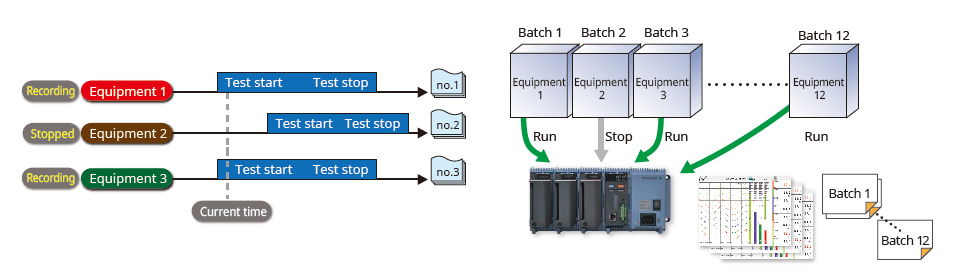 Rejestrowanie wstępnie zdefiniowanych grup kanałów w oddzielnych plikach danych z niezależnym sterowaniem uruchamianiem i zatrzymywaniem. Można utworzyć do 12 partii.