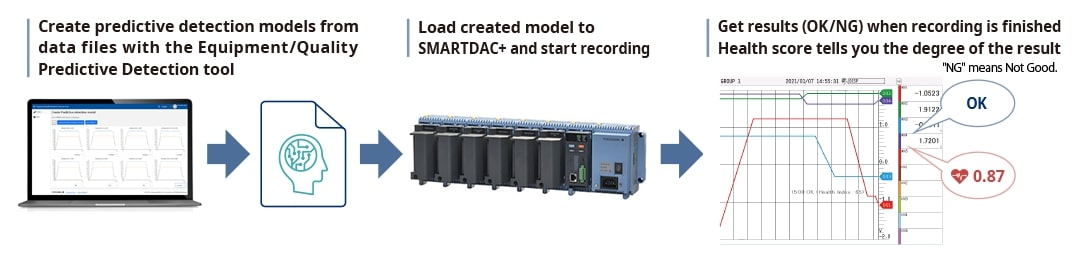 Dzięki łatwemu tworzeniu predykcyjnych modeli wykrywania na podstawie zarejestrowanych w przeszłości danych OK/NG (Not Good) i ładowaniu ich do GM, można przewidywać nieprawidłowości w sprzęcie produkcyjnym i pogorszenie jakości produktu na wczesnym etapie. A ponieważ wyniki zdrowotne, które pokazują stopień normalnych i nienormalnych danych, uwzględniają korelacje między wieloma danymi w celu dokonania ustaleń, mogą one uchwycić przewidywanie nieprawidłowości, które są trudne do wykrycia przez ludzi.