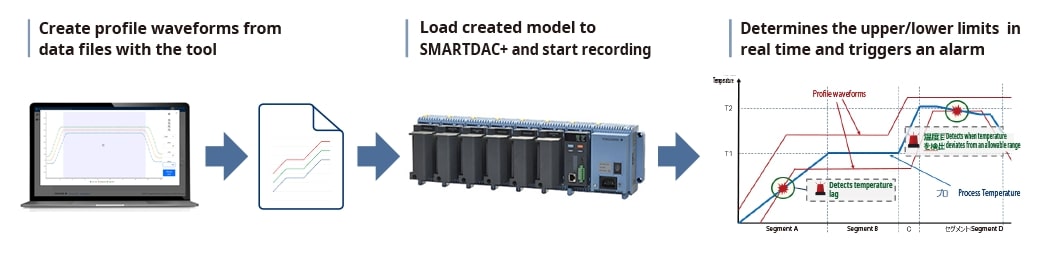 Tworząc przebieg profilowy z danych zarejestrowanych w przeszłości i ładując go do GX/GP, przebieg ten można wykorzystać jako próg dla wartości procesowych. Przebiegi profilowe są przydatne w aplikacjach, w których wartości procesowe zmieniają się w czasie. Ponadto na ekranie można zobaczyć odchylenie od przebiegu referencyjnego.