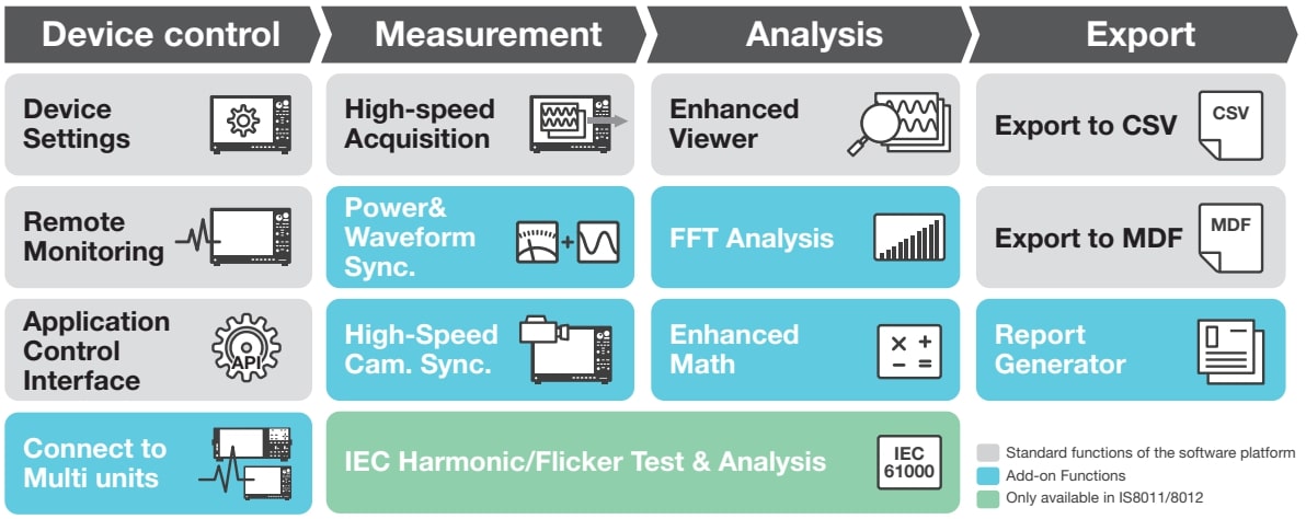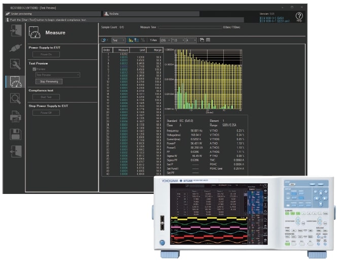 Opcjonalny pakiet oprogramowania IS8011/IS8012 jest przeznaczony do wykonywania testów harmonicznych i migotania światła zgodnie z normami IEC61000-3-2, 3-3, 3-11 i 3-12 przy użyciu precyzyjnego analizatora mocy WT5000. Użytkownicy mogą łatwo ustawić warunki i wygenerować raport z testu bez specjalistycznej wiedzy. Użytkownicy mogą dokonać oceny pozytywnej/negatywnej według klasy A, B, C i D wartości pomiarowych prądu harmonicznego.