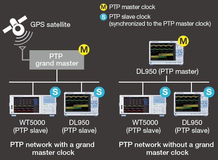 IEEE 1588 jest standardem dla Precision Time Protocol (PTP), protokołu do precyzyjnej synchronizacji czasu przyrządów sieciowych i systemów sterowania. Serwer grandmaster PTP zapewnia zegar referencyjny dla każdego przyrządu klienckiego w celu uzyskania precyzyjnej synchronizacji zegara. Ponieważ ScopeCorder DL950 ma funkcję master PTP, precyzyjna synchronizacja zegara odpowiednich przyrządów w tej samej sieci jest możliwa nawet bez serwera PTP grandmaster. IS8000 może również łączyć jednoczesne dane pomiarowe każdego z tych zsynchronizowanych PTP przyrządów w tym samym oknie.
