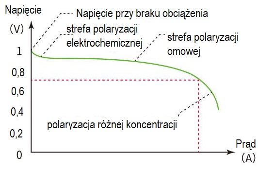 | Na napięcie wyjściowe stosu rzeczywistych ogniw paliwowych mają wpływ warunki jazdy. Gdy warunki pracy ulegają zmianie, to napięcie wyjściowe stosu można przedstawić jako trzystopniową krzywą w związku z reakcją na wewnętrzną polaryzację. Poszczególne stopnie krzywej to: strefa polaryzacji elektrochemicznej, strefa polaryzacji omowej oraz strefa polaryzacji różnicy koncentracji. | ![]() |