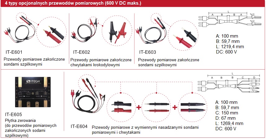 Przewody IT-E602 są przeznaczone do dokładnego pomiaru rezystancji wewnętrznej akumulatora z użyciem metody czteroprzewodowej. Przewody są zakończone dużymi chwytakami krokodylowymi.