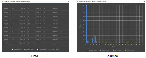 Zasilacze serii IT-M7700 mierzą harmoniczne napięcia i prądu do 50. w paśmie od 45 Hz do 50 Hz. Wyniki analizy wyświetlają w sposób czytelny w postaci listy lub diagramu słupkowego (funkcja „kolumny”), jak to przedstawiono na rysunkach poniżej.