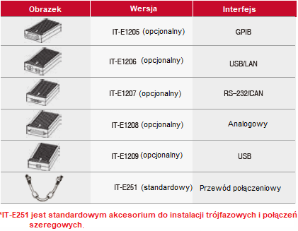 • Opcjonalne interfejsy RS232, CAN, LAN, GPiB, USB_TMC, USB_VCP, zewnętrzny analogowy, we/wy