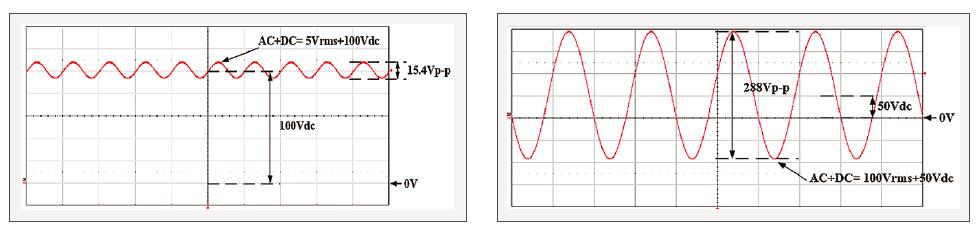 Tryby wyjściowe zasilaczy serii IT-M7700 obejmują wyprowadzanie przebiegów AC, DC i AC+DC. Zapewniają nie tylko czysty przebieg wyjściowy AC lub DC, umożliwiają też w trybie AC+DC poszerzyć obszar zastosowań, w tym testować elementy charakteryzujące się offsetem DC.