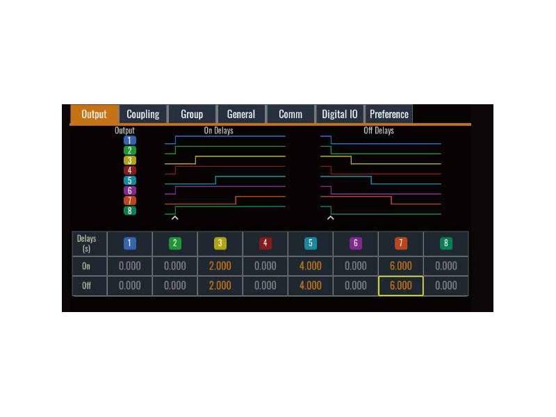 Funkcja opóźnienia włączenia/wyłączenia dla każdego wyjścia umożliwia serializację włączenia/wyłączenia wyjścia.