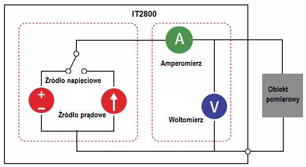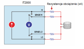 Gdy mierzy się małe rezystancje, to rezystancja przewodów połączeniowych może powodować znaczne błędy pomiarowe. Aby poradzić sobie z tym problemem, źródło mierzące IT2805 wykorzystuje do pomiaru konfigurację czteroprzewodową. Na rysunku przedstawiono schemat takiego połączenia. W dwóch z czterech przewodów konfiguracji jest wymuszany przepływ prądu, a pozostałe dwa służą do pomiaru napięcia. Ponieważ w przewodach pomiarowych napięcia nie płynie prawie żaden prąd, zatem można nimi zmierzyć dokładnie napięcie występujące w danym momencie na obiekcie pomiarowym.