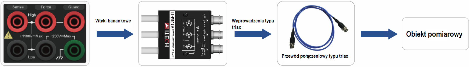 Aby spełnić wymagania pomiaru bardzo małych prądów, źródło mierzące serii IT2805 zapewnia ochronę opcjonalnych akcesoriów, tj. przejściówek z bananków na triax i triaxalnego kabla o małej upływności. Gdy akcesoria te są używane jednocześnie, to przewód guard jest na takim samym potencjale, na jakim jest przewód środkowy. Ponieważ nie ma tu różnicy potencjałów, nie ma zatem również przepływu prądu między przewodem środkowym a przewodem guard. Chroni to wyniki pomiarów przed negatywnym wpływem na nie prądu upływowego.