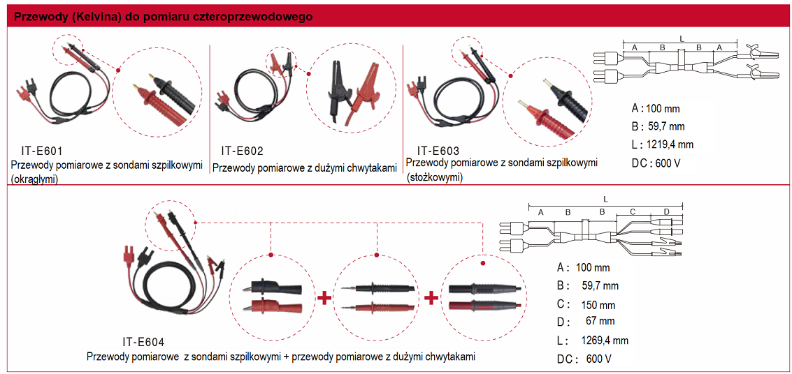 | IT-E604 | przewody pomiarowe szpilkowe + przewody pomiarowe z dużymi chwytakami | |