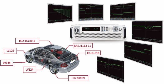 W elektronice motoryzacyjnej spotyka się często z zakłóceniami zasilania powstającymi w trakcie rozruchu i pracy silnika. Aby testowany obiekt mógł zostać zbadany na tę okoliczność, tester musi w trakcie sprawdzenia zasymulować warunki najgorszego przypadku zakłócenia zasilania. Przyrządy serii IT6000B mają wbudowane krzywe napięcia zgodne z odpowiednimi normami przemysłowymi LV123, LV148, DIN40389, ISO-16750-2, SAEJ1113-1, LV124 i ISO21848. W celu przeprowadzenia testu użytkownik może łatwo i bezpośrednio przywoływać różne przebiegi takie, jak na przykład przebieg spadku napięcia w trakcie rozruchu silnika, przebieg impulsowy oraz inne przebiegi związane z elektronicznymi układami samochodowymi. Dostępne napięcia testu to 12 V, 24 V i 48 V.