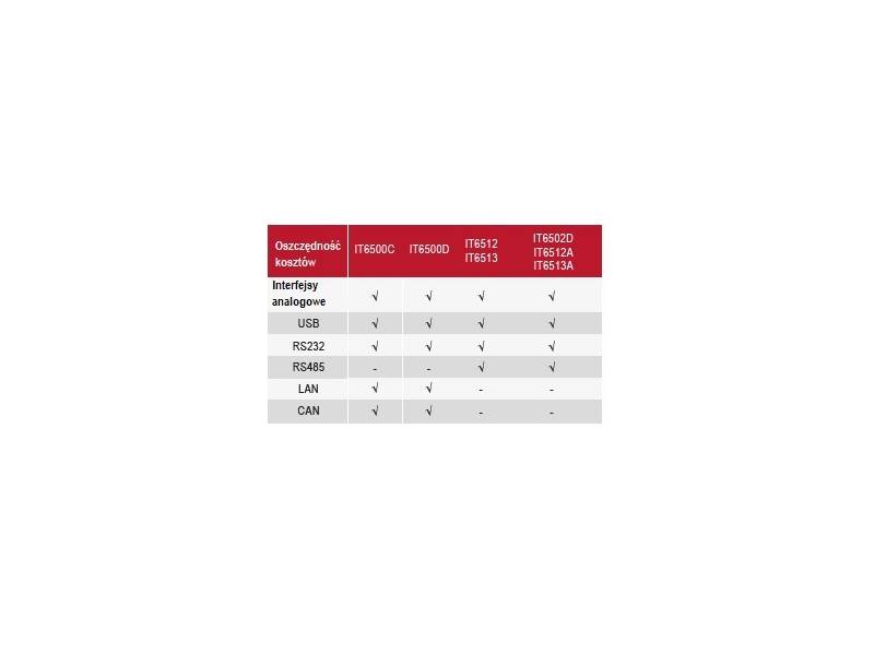 W przypadku konwencjonalnych przyrządów mierzących duże moce, potrzeba zakupu każdego dodatkowego interfejsu generuje koszty. Zasilacze rodziny IT6500 mają standardowo wbudowane wszystkie potrzebne interfejsy. Przy potrzebie zmiany interfejsu upraszcza to proces konfigurowania i zwiększa elastyczność użytkowania zasilacza, bez ponoszenia żadnych dodatkowych kosztów.