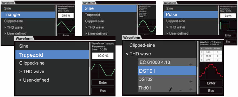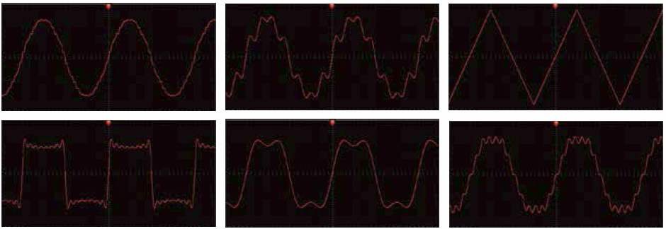 Na ekranie przyrządu mogą być wyświetlane w czasie rzeczywistym krzywe napięcia i prądu, maksymalnie 6 przebiegów. Użytkownik może natychmiast je analizować (bez potrzeby używania do tego zewnętrznego oscyloskopu), a następnie wprowadzać do pamięci przyrządu.