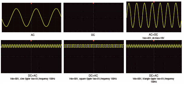 W pierwszym rzędzie kolejno: przebieg przemienny (AC), przebieg stały (DC) oraz przebieg przemienny o napięciu 45 V z nałożoną składową stałą równą 10 V