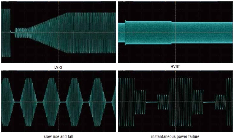 Low voltage ride-through (LVRT) odnosi się do zdolności systemu wytwarzania energii do kontynuowania pracy bez odłączania się od sieci w pewnym zakresie spadku napięcia, gdy awaria sieci lub zakłócenie powoduje spadek napięcia, a nawet zapewnia moc bierną, aby pomóc systemowi odzyskać napięcie. Parametry testu można edytować w warunkach LVRT. Dzięki szybkiej reakcji może w pełni spełnić wymagania testowe LVRT. Jednocześnie seria IT7900EP posiada funkcję arbitralnego kształtu fali. Dzięki funkcji LIST można edytować i symulować różne przebiegi zakłóceń sieci za pomocą panelu lub oprogramowania, takie jak chwilowa awaria zasilania, przepięcia oraz wzrost i spadek napięcia.