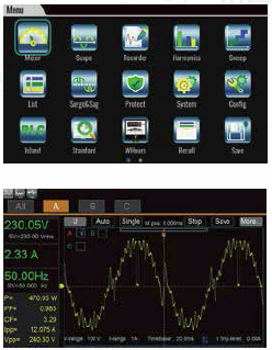 | Intuicyjny ekran dotykowy Przyrządy serii IT7900 wyposażono w nowo zaprojektowany ciekłokrystaliczny ekran dotykowy, graficzny interfejs użytkownika o prostej i intuicyjnej obsłudze oraz klawiaturę z pokrętłem, które pozwalają użytkownikowi bezpośrednio i szybko prowadzić testy. Wbudowana funkcja oscyloskopu cyfrowego umożliwia zbieranie sygnałów napięcia i prądu w domenie czasowej, zależności przesunięć fazowych, w tym korzystanie z funkcji wyzwalania przebiegu. Maksymalny okres próbkowania w trybie oscyloskopu wynosi 10 µs, przy czym jest możliwe wyświetlenie w tym trybie jednocześnie do 6 krzywych. Użytkownik przyrządu może prowadzić analizę krzywych i jednocześnie zapisywać je bez potrzeby angażowania do tego osobnego oscyloskopu. |