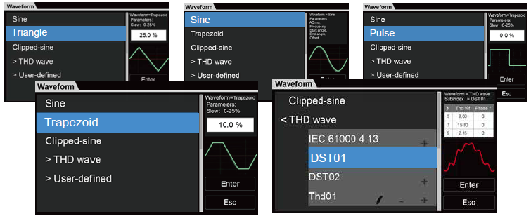 Oprócz przebiegu sinusoidalnego przyrządy serii IT7900E wyprowadzają różne standardowe przebiegi AC takie, jak przebieg o kształcie trójkątnym, prostokątnym, trapezoidalnym, a także przebieg piłokształtny i sinusoidalny obcięty. Można je łatwo przywoływać z menu i wyświetlać na ciekłokrystalicznym ekranie dotykowym. Użytkownik może ponadto w połączeniu z funkcją programowania sekwencji pomiarowej realizować wyprowadzanie ciągłe kilku przebiegów, aby poradzić sobie ze złożonym testem anomalii występujących w sieci zasilającej.