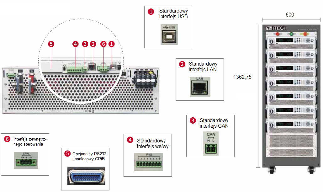 • Wbudowane interfejsy standardowe: USB, CAN, LAN, cyfrowy we/wy oraz opcjonalne GPiB, analogowy+RS232