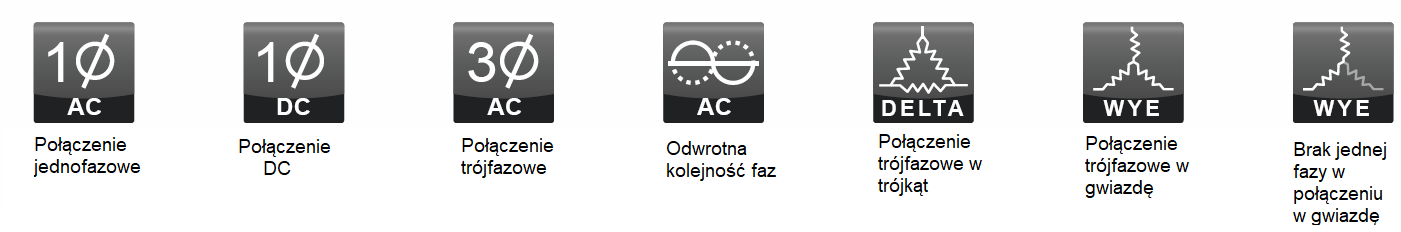 • Przełączanie układu sieci: jednofazowy, trójfazowy, odwrotnej kolejności faz; możliwość zwiększenia napięcia znamionowego o 200% przy odwróconej kolejności faz