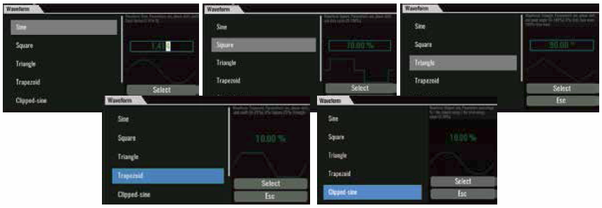 Obciążenia serii IT8200 mają wbudowane przebiegi sygnału sinusoidalnego, trójkątnego, trapezoidalnego oraz sinusoidalnego obciętego. Przebiegi te można przywoływać za pośrednictwem ekranowego menu i wyświetlać. Można ponadto spełniać wymagania złożonego testowania, edytując następnie odpowiednie parametry.