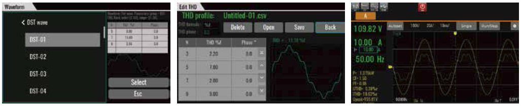 Pomiar harmonicznych jest jednym ważniejszych elementów testu przy badaniu podatności EMC (kompatybilności elektromagnetycznej). Obciążenia serii IT8200 mają wbudowane 30 przebiegów współczynnika zniekształceń harmonicznych (THD) łatwych do przywołania. Ustawiając amplitudę i fazę, można symulować harmoniczne do 50. (przy częstotliwości wynoszącej 50 Hz lub 60 Hz), tworząc odkształcony przebieg okresowy.