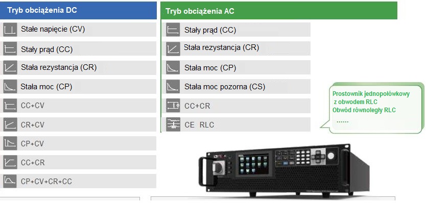 • Tryb AC z rodzajami pracy: stałego prądu (CC), stałej mocy (CP), stałej mocy pozornej (CS) oraz stałej rezystancji (CR), a ponadto emulacja układów (CE): obwodu równoległego RLC oraz obwodu RLC prostownika jednofazowego