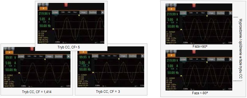 Współczynnik szczytu określa ekstremalne wartości szczytowe przebiegu sygnału. W przypadku aplikacji wymagających czystego sygnału sinusoidalnego wymaga się zwykle, aby wartość współczynnika szczytu była równa 1,414, lub była możliwie najbliższa tej wartości. W praktyce jednak kształt piku przebiegu prądu obciążenia może być bardzo ostry i współczynnik szczytu często większy od 1,414. Wtedy punkt początkowy sygnału sinusoidalnego zaczyna przesuwać się od 0 stopni w kierunku stopni dodatnich i trzeba skorygować przebieg. Współczynnik szczytu obciążeń serii IT8200 można regulować w przedziale od 1,414 do 5,0, można też ustawiać wartość kąta przesunięcia fazowego od -90° do +90°, korygować wynikające stąd zmiany amplitudy i dbać, aby wartość skuteczna pozostała niezmieniona. Dzięki temu można dokładniej symulować warunki testu w terenie i zapewniać rzetelność przeprowadzanego testu.