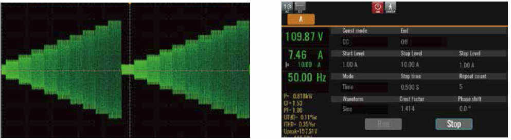 Współczynnik szczytu określa ekstremalne wartości szczytowe przebiegu sygnału. W przypadku aplikacji wymagających czystego sygnału sinusoidalnego wymaga się zwykle, aby wartość współczynnika szczytu była równa 1,414, lub była możliwie najbliższa tej wartości. W praktyce jednak kształt piku przebiegu prądu obciążenia może być bardzo ostry i współczynnik szczytu często większy od 1,414. Wtedy punkt początkowy sygnału sinusoidalnego zaczyna przesuwać się od 0 stopni w kierunku stopni dodatnich i trzeba skorygować przebieg. Współczynnik szczytu obciążeń serii IT8200 można regulować w przedziale od 1,414 do 5,0, można też ustawiać wartość kąta przesunięcia fazowego od -90° do +90°, korygować wynikające stąd zmiany amplitudy i dbać, aby wartość skuteczna pozostała niezmieniona. Dzięki temu można dokładniej symulować warunki testu w terenie i zapewniać rzetelność przeprowadzanego testu.