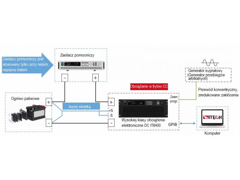 Urządzeń serii IT8400 można używać do sprawdzania impedancji wyjściowej cel ogniw paliwowych. Wykonując okablowanie pomiarowe przed przeprowadzeniem takich testów, należy kierować się poniższymi wskazówkami: