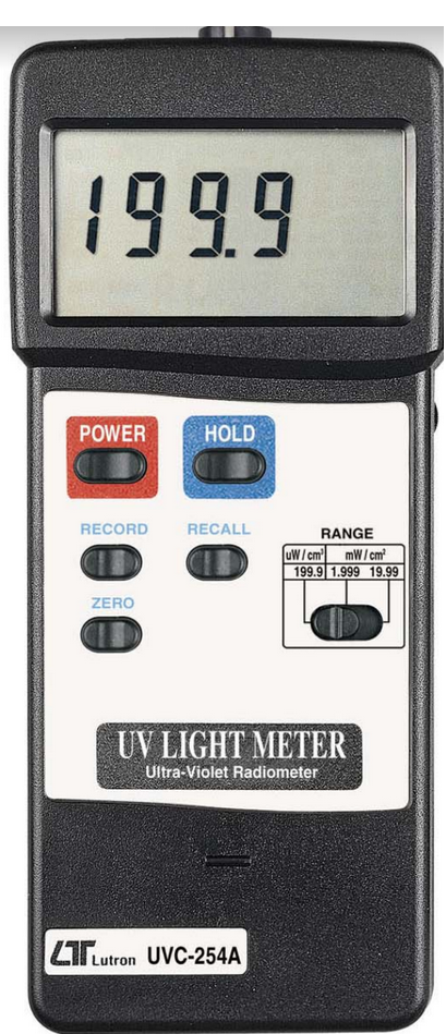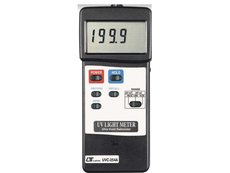 Lutron UVC254A to miernik natężenia promieniowania UV o trzech zakresach pomiarowych: 199,9 uW/cm2; 1,999 mW/cm2; 19,99 mW/cm2.