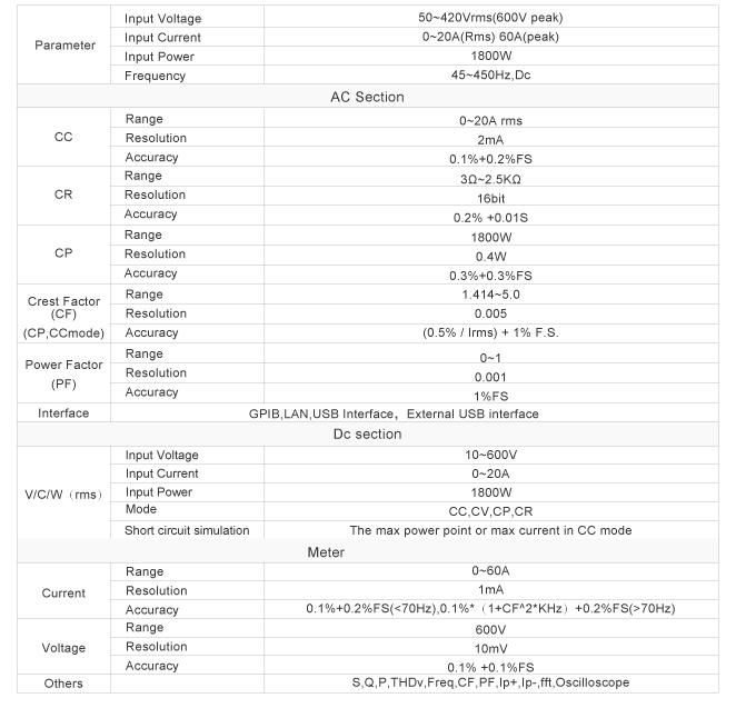 - Tryby pracy dla obciążenia DC: CC, CR, CP, CV