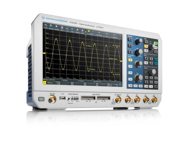 Oscyloskop RTB2004 to czterokanałowy oscyloskop cyfrowy z 10-bitowym przetwornikiem ADC, pamięcią 10 Mpkt oraz 10,1-calowym ekranem. Te cechy w połączeniu z inteligentną koncepcją obsługi sprawiają, że oscyloskopy z serii R&S®RTB2000 są doskonałym narzędziem laboratoryjnym. Urządzenie doskonale sprawdza się przy rozwiązywaniu problemów podczas projektów, z powodzeniem odnajdzie też zastosowanie w laboratoriach uniwersyteckich oraz w działach produkcji czy w serwisie.