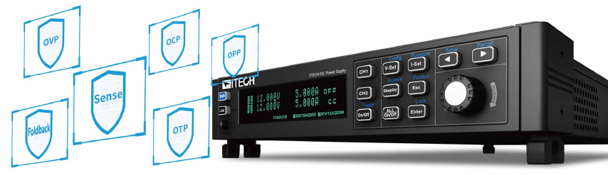 Dwukanałowy zasilacz DC IT-M3100D posiada różne funkcje zabezpieczające, takie jak OCP / OVP / OTP / OPP / U-Max/U-Min/Sense/Foldback. Funkcja Sense pomaga w porę wyemitować ostrzeżenie i przełączyć zasilanie na wyjście lokalne w przypadku awarii zacisku wyjściowego. Funkcja Foldback służy do wyłączania wyjścia, gdy przełączane jest zasilanie CV / CC, co pozwala chronić DUT wrażliwe na przekroczenia napięcia i prądu.