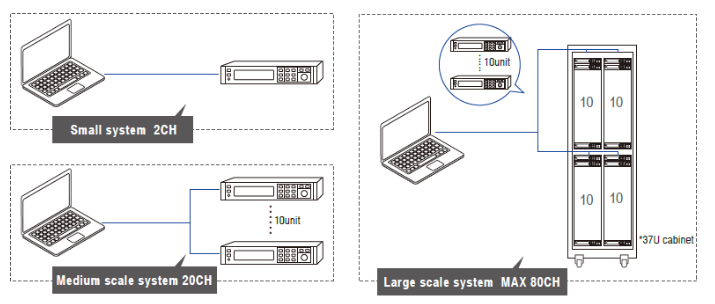 W dwukanałowym zasilaczu DC IT-M3100D zastosowano niezależną konstrukcję wielokanałową, która ułatwia łączenie zasilacza z komputerem. Po utworzeniu wielokanałowego systemu zasilania numer kanału będzie wyświetlany na interfejsie każdego zasilacza. Jeśli interfejs komunikacyjny jednej z jednostek jest podłączony do komputera, można niezależnie sterować programowo każdym zasilaczem w systemie. Każdy kanał może być obsługiwany niezależnie. Szafa 37U może zawierać do 40 jednostek/80 kanałów, co znacznie zwiększa stopień wykorzystania sprzętu.