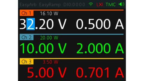 Wszystkie podstawowe funkcje zasilaczy R&S®NGE100B mogą być obsługiwane bezpośrednio za pomocą przycisków na panelu przednim. Pokrętło odgrywa główną rolę w regulacji napięcia i prądu oraz ustawianiu limitów dla wielofunkcyjnych funkcji zabezpieczających. Warunki pracy wszystkich kanałów są wyświetlane na ekranie jednocześnie. Aktywne kanały są wskazywane przez podświetlony przycisk kanału. Aktywne wyjścia są wyświetlane na zielono podczas pracy w trybie stałego napięcia i na czerwono podczas pracy w trybie stałego prądu. Nieaktywne wyjścia są wyświetlane na biało.