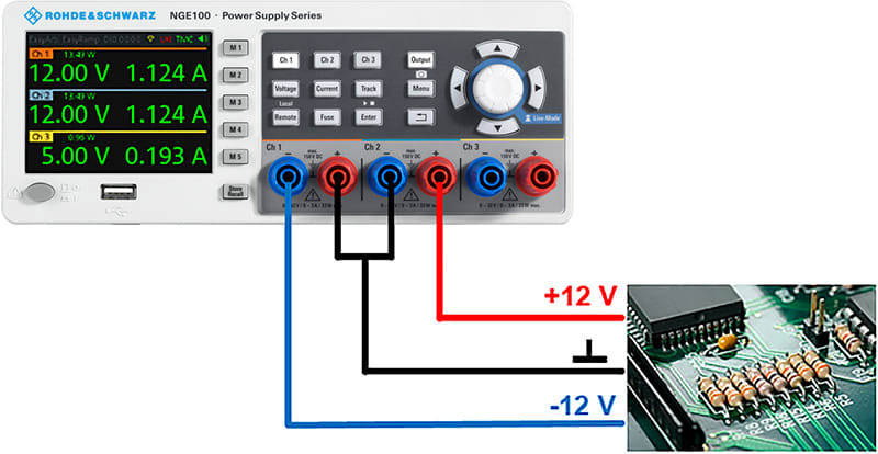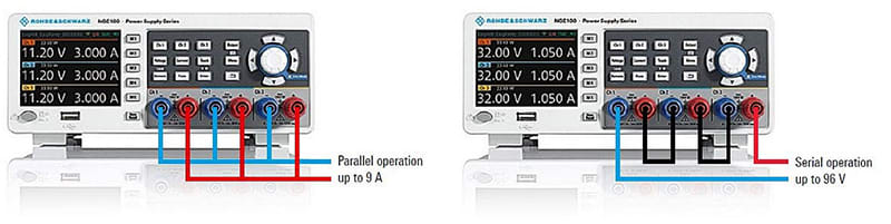 Ponieważ wszystkie kanały są elektrycznie równoważne, można je łączyć w trybie szeregowym w celu uzyskania wyższych napięć. W przypadku R&S NGE103B można uzyskać do 96 V, a w przypadku R&S NGE102B do 64 V. W trybie równoległym kanały można łączyć w celu uzyskania wyższego prądu. Łącząc dwa kanały można uzyskać do 6 A. Używając wszystkich trzech kanałów R&S NGE103B, można uzyskać nawet 9 A.