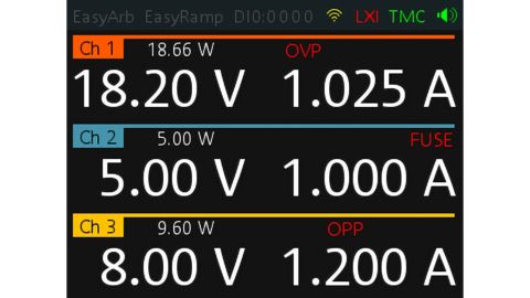 Jeśli taki limit zostanie osiągnięty, dany kanał wyjściowy zostanie automatycznie wyłączony i wyświetlony zostanie komunikat (FUSE, OVP lub OPP). Zabezpieczenie nadprądowe można połączyć z innymi kanałami (funkcja FuseLink). W takim przypadku kanał przekraczający maksymalny poziom prądu i wszystkie połączone kanały zostaną wyłączone.