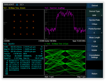 – Tryby wizualizacji obejmują eye-diagramy i konstelacje