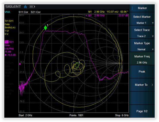 – Wykres Smitha - Jednoczesne wyświetlanie S11 i S21 zapewnia proste i intuicyjne pomiary impedancji